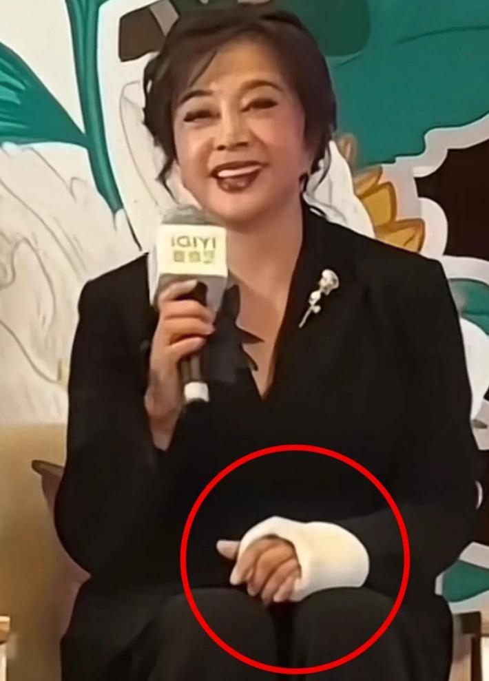 她不会刻意回避左臂的石膏,反而带着绷带和宁静、刘嘉玲开玩笑。